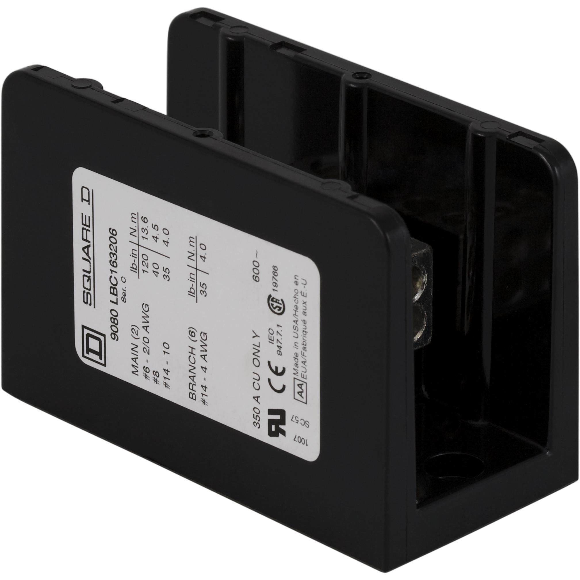 Sets the ampere rating to 350 A. The line side connection type Screw Connection provides reliable electrical connections. Line side connections for each pole 2 are designed for multi-terminal configurations. Line side wire/stud gauge 2/0-14 AWG ensures compatibility with various conductors. Connector type on the load side Screw Connection for dependable wiring connections. Connections for each pole on the load side 6 for devices with several terminals. Gauge of wire or stud on the load side 4-14 AWG for conductor compatibility. Overall number of poles 1 for switches or motors. Type of housing Box for safeguarding or transporting components. Product status Active concerning availability and lifecycle. Classification series for the product or component Square D. Type classification Power Distribution Block for specifications. The operating voltage rating of the device 600 V.