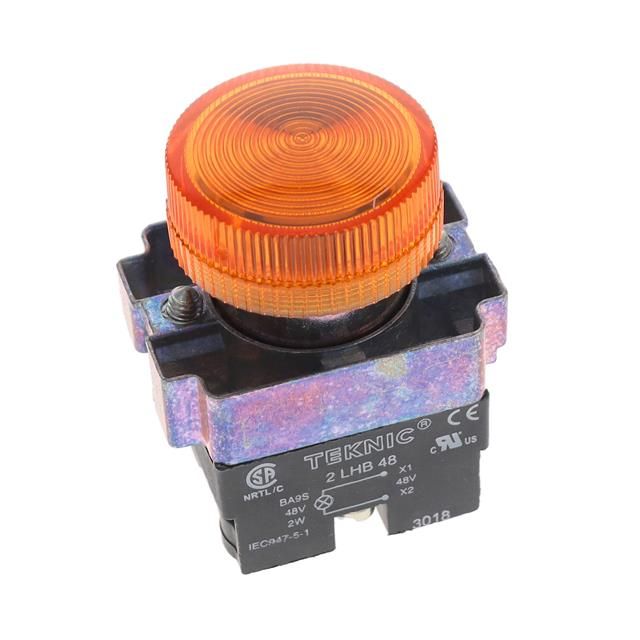 Rated with IP IP65, NEMA 4X, 12 to safeguard against dust and moisture penetration. Bulb emits Amber color for efficient lighting. Lens dimensions 28.00mm Dia for proper fitting and application. Lens configuration Round with Flat Top combining utility with aesthetic appeal. Type of housing Bulk for safeguarding or transporting components. Specifications of the cutout 0.87" (22.00mm) for accurate mounting. Shape of the cutout Round for installation guidelines. Product status Active concerning availability and lifecycle. Criteria AC/DC for electrical, mechanical, or environmental performance. Type classification LED for specifications. The voltage specification 48V for electrical parameters.