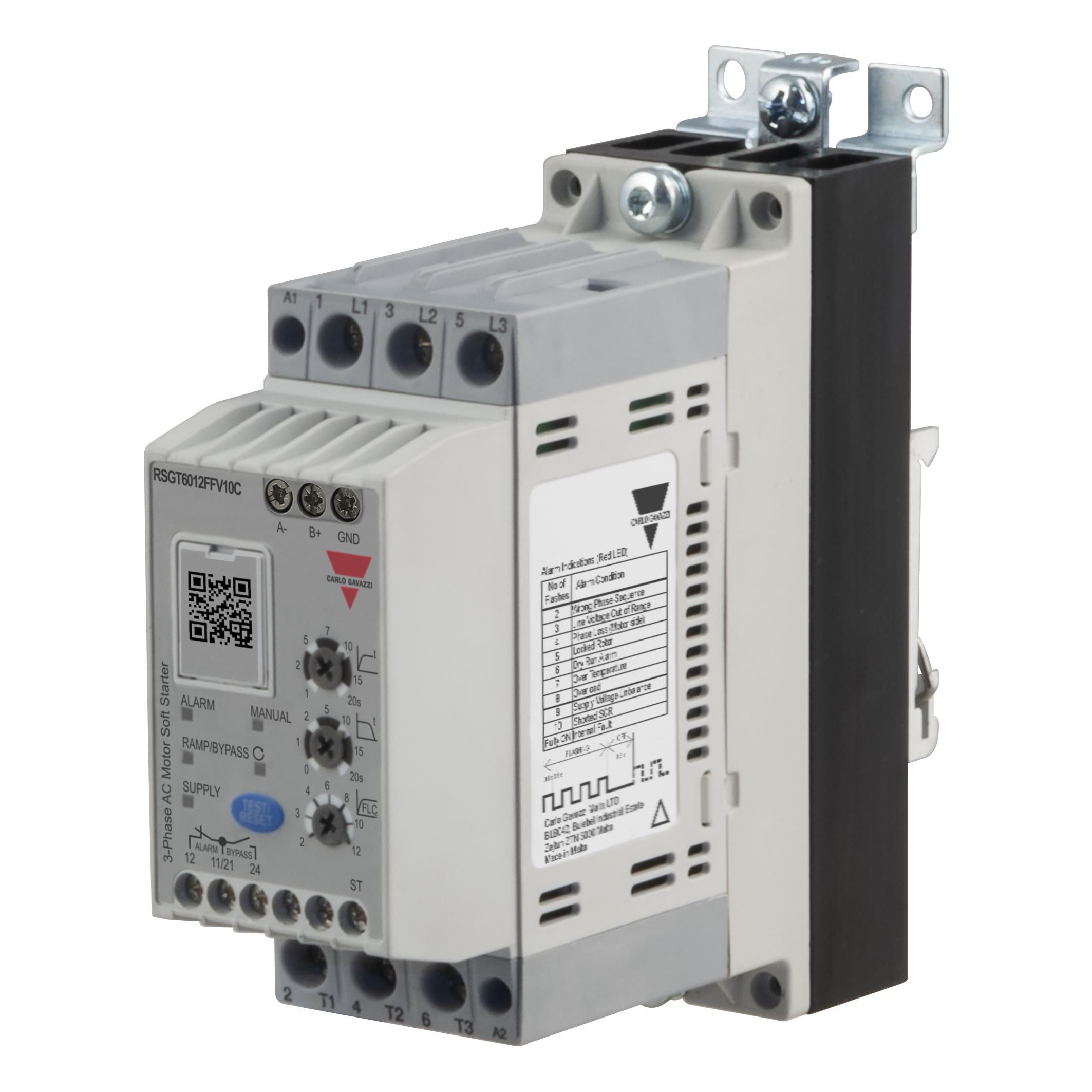 Operates with a control or drive type labeled as Soft Start / Stop. Yields output current measured at 12A. Designed for RS-485 ease of use and user interaction. Type of motor AC Motor for mechanical functionality. Mounting configuration DIN Rail for structural stability. Overall motors 1 for mechanical uses. Temperature range -20°C ~ 60°C for environmental conditions impacting thermal efficiency. Type of housing Bulk for safeguarding or transporting components. Product status Active concerning availability and lifecycle. Classification series for the product or component RSGT. Voltage requirement 24VAC/DC for electrical specifications. Type classification Module for specifications. Load voltage 220 ~ 600V required for devices. Voltage supply 24VAC/DC for device operation. Energy consumption 9 kW for appliances.