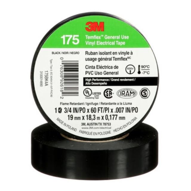 Applies Rubber adhesive for strong and lasting bonding. Constructed with PVC (Poly Vinyl Chloride) backing/carrier materials for durability. Offered in a shade referred to as Black to enhance the system's aesthetics. Overall length 60' (18.3m) 20 yds for size indication. Type of housing Bulk for safeguarding or transporting components. Product status Active concerning availability and lifecycle. Classification series for the product or component Temflex™ 175. The category of tape Conformable Vinyl intended for packaging or insulation purposes. The temperature limits 19°F ~ 194°F (-7°C ~ 90°C) for safe operation. Measurement of thickness 0.0070" (7.0 mils, 0.178mm) for material or component dimensions. Application Insulating for defined purpose or objective. Horizontal width measurement 0.75" (19.05mm) 3/4".