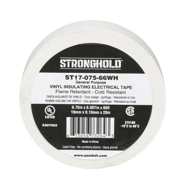 Applies Pressure Sensitive Adhesive (PSA) adhesive for strong and lasting bonding. Constructed with PVC (Poly Vinyl Chloride) backing/carrier materials for durability. Assesses resistance at forward current Tariff may apply if shipping to the United States for LED or diode testing. Offered in a shade referred to as White to enhance the system's aesthetics. Overall length 66' (20.1m) 22 yds for size indication. Type of housing Bulk for safeguarding or transporting components. Product status Active concerning availability and lifecycle. Classification series for the product or component StrongHold™. The category of tape Electrical intended for packaging or insulation purposes. The classification for import duties Tariff may apply if shipping to the United States related to import and export transactions. The temperature limits 14°F ~ 176°F (-10°C ~ 80°C) for safe operation. Measurement of thickness 0.0070" (7.0 mils, 0.178mm) for material or component dimensions. Application Insulating, Sealing, Splicing for defined purpose or objective. Maximum Vce(on) at Vge Tariff may apply if shipping to the United States for transistor specifications. Horizontal width measurement 0.75" (19.05mm) 3/4".