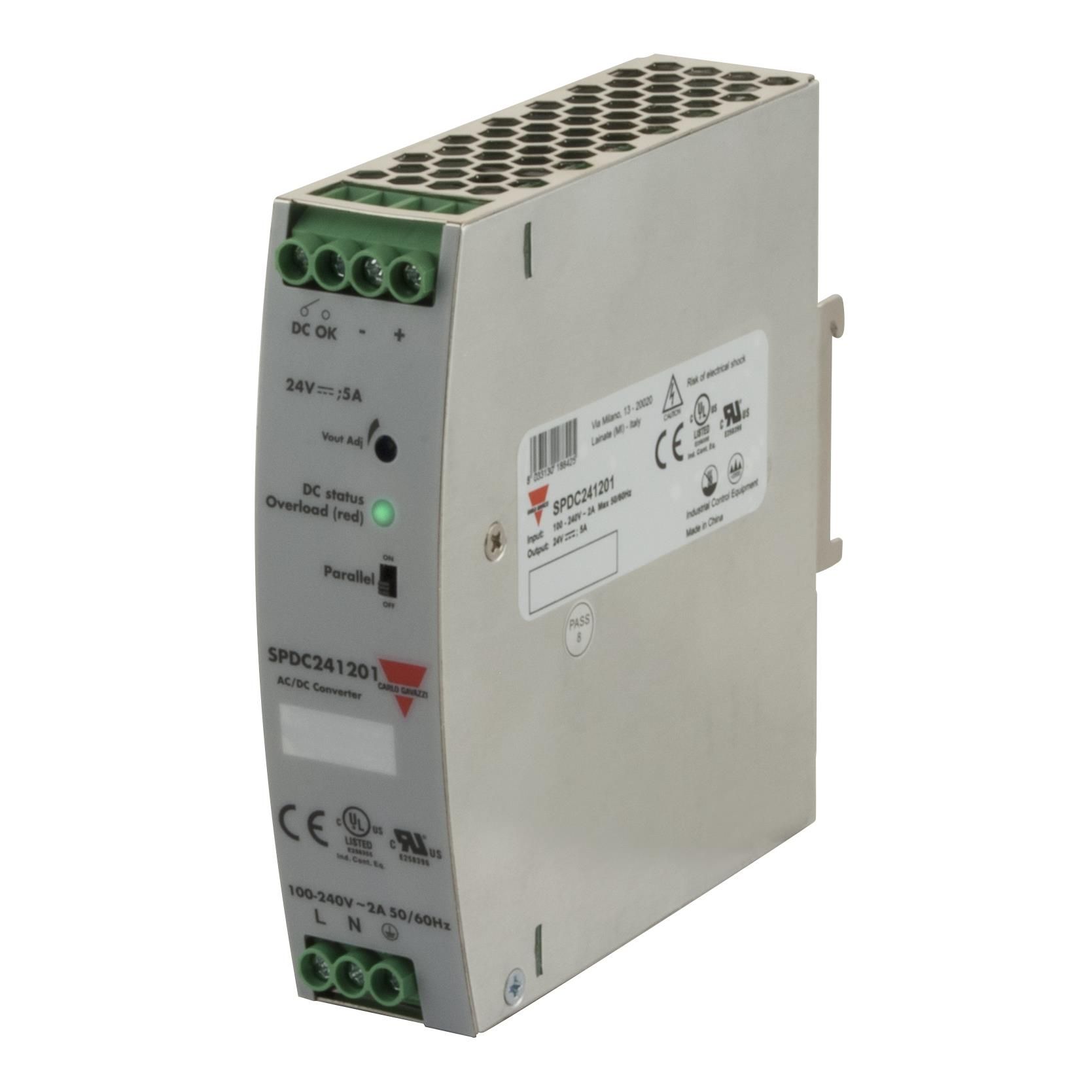 Supports an AC input voltage rated at 85 ~ 264 VAC for extensive operational compatibility. Perfectly designed for situations involving Industrial, ITE (Commercial). Complies with the criteria of entities acknowledged as CE, cULus, cURus. Assesses resistance at forward current Tariff may apply if shipping to the United States for LED or diode testing. Supplies peak output current defined as 5A. Allows for a maximum DC input voltage of 375V. Requires a minimum DC input voltage of 127V. Offers an efficiency rating calculated at 91%. Equipped with features categorized as Adjustable Output, IP20, PFC, Universal Input. Configured with AC or DC input type for diverse applications. The input voltage established at 85 ~ 264 VAC for reliable performance. Overall outputs 1 for device connections. Temperature range -25°C ~ 70°C (With Derating) for environmental conditions impacting thermal efficiency. Voltage 24V for optimal output electric potential. Type of housing BulkBox for safeguarding or transporting components. Power measured in watts 120W for optimal operation. Product status Active concerning availability and lifecycle. Classification series for the product or component SPDC (120W). Details on package size 4.49" L x 1.26" W x 4.88" H (114.0mm x 32.0mm x 124.0mm) for electrical or mechanical components. Measurement dimensions 4.49" L x 1.26" W x 4.88" H (114.0mm x 32.0mm x 124.0mm) for component specifications. The classification for import duties Tariff may apply if shipping to the United States related to import and export transactions. Maximum Vce(on) at Vge Tariff may apply if shipping to the United States for transistor specifications. Isolation voltage 3 kV for electrical safety. Output 1 voltage 24V across different outputs.